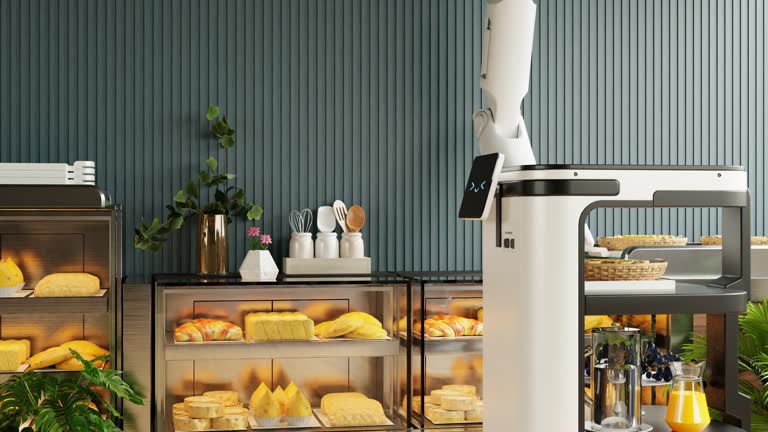 Robots help manage and transport food and deliver it to customers- 3D rendering