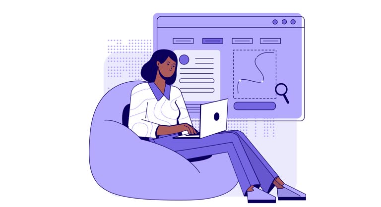 Business activity scene. Moving banner with female entrepreneur or office worker studying financial statistics and developing strategy to achieve success. Data Analysis. Cartoon flat animated graphics